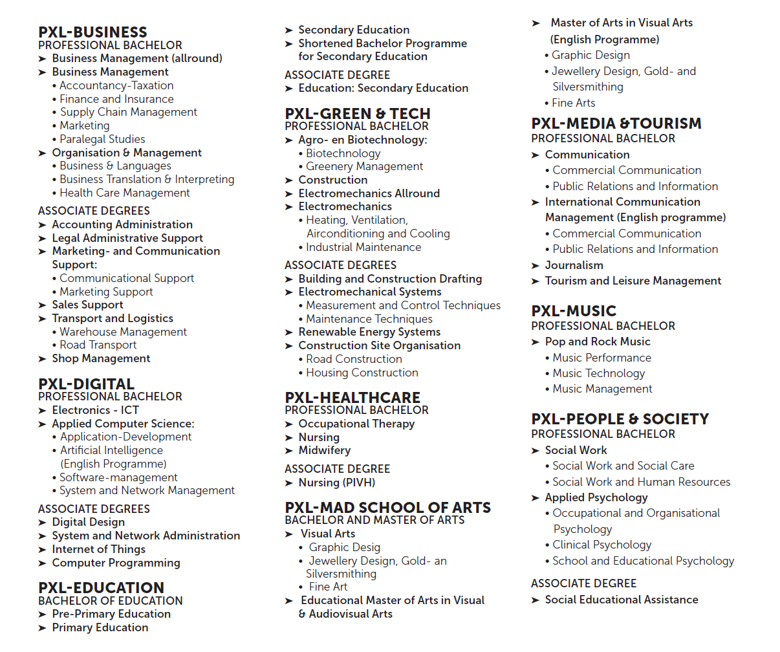 These are the degree programmes at PXL. A degree programme is started and completed at PXL. Upon successful completion of the full programme, you will obtain a degree of PXL.
